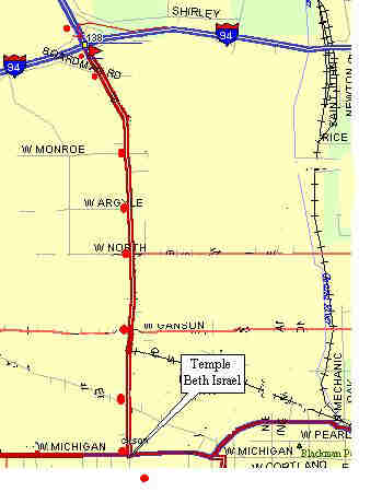 To Jackson map From I-94 and the North End Motels 1. Simply get onto US 127 South (that is the ramp on the West side of the Springport Road Bridge). 2. Bear out of the Exit Only Lane to Chicago and go straight. Once under I-94 the road becomes West Avenue. 3 Follow West Avenue to the Temple at the Corner of Michigan Avenue (Bus. Route 94) From Ann Arbor 1. Take I-94 West to Exit 138. (This is one after Cooper) 2. Take the left split from the exit ramp and go to the stoplight. 3. Turn Left onto US 127 South (go under highway). Once under I-94 the road becomes West Avenue. 4. Follow West Avenue to the Temple at the Corner of Michigan Avenue. Note that you will cross a small but steep bridge over a railroad. Michigan Avenue is the second light after the bridge. 5. Continue slightly past the temple on West Avenue to reach the temple parking lot on the left. From Lansing Once under I-94 the road becomes West Avenue. 1. Take US 127 South to Jackson. 2. Stay on the road it becomes - West Avenue 3. Follow West Avenue to the Temple at the Corner of Michigan Avenue To Jackson map