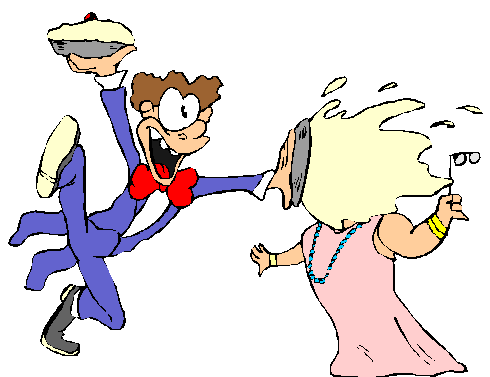The Pie Fight? does not arise out of that curious custom where bride and groom are supposed to feed each other of the wedding cake. It is odd that one or both often seem to think that much of the cake should go up their new spouse's nose. While this practice is somewhat amusing, it has nothing to do with the Pie Fight. Why a Pie Fight? Twenty-five years ago Bob worked for the University of Michigan in their Energy Management Department. His immediate supervisor was a very nice man from India named Abul. Abul explained that he had an arranged marriage and that his wedding took place over three days. Apparently this is a relatively short wedding for that part of the world, but still quite elaborate. Abul's wedding took place in some kind of a rented wedding palace or facility that had a large walled yard. The yard had a processional path up the middle and set into the ground along either side of the path were long bamboo poles or sticks wrapped with garlands of flowers. All in all a lovely effect. Abul explained that on the third day the families and friends all gathered in the court yard arranged on either side of the path with groom's parties opposite bride's parties. At an announced moment the groups crowded forward and pulled the bamboo poles from the ground and proceeded to - as Abul put it, "Whack the hell out of each other". He noted that the bamboo was actually center cut in the manner of classic slap-sticks and no one would get hurt. Flowers pretty much exploded all over the place. Of course, I wanted to know "Why?" Abul calmly explained that "You cannot have a three day wedding without pissing someone off. This way everybody can get it out of their system". Could this be true? Do people occasionally get disgruntled in connection with weddings? Oh, of course not. Obviously, we cannot produce a full-fledged floral Samurai Attack without significant risk. On the other hand, the same effect can be had with a short, but furious Pie Fight. Remember, Soupy Sales was from Michigan.