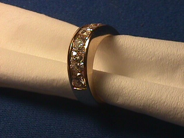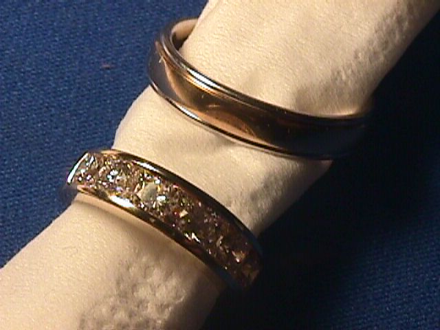 Mare's Ring is a channel cut with six larger round cut diamonds set flush with the upper edge of the setting and ten smaller round cut diamonds set in the spaces between and just below the crowns of the larger stones. Bob's Ring is two ridges of platinum with a wide center band of yellow gold. He picked this out not knowing that his Dad's wedding ring is the is same exact style in all yellow gold. Go figure. |